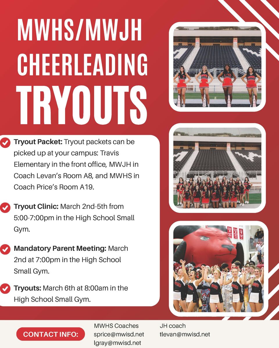 Hello Parents,We are excited to share information about upcoming Cheer Tryouts! Please review the important dates below and mark your calendars:Tryout Clinic:📅 March 2–5🕔 5:00–7:00 PM📍 High School ...